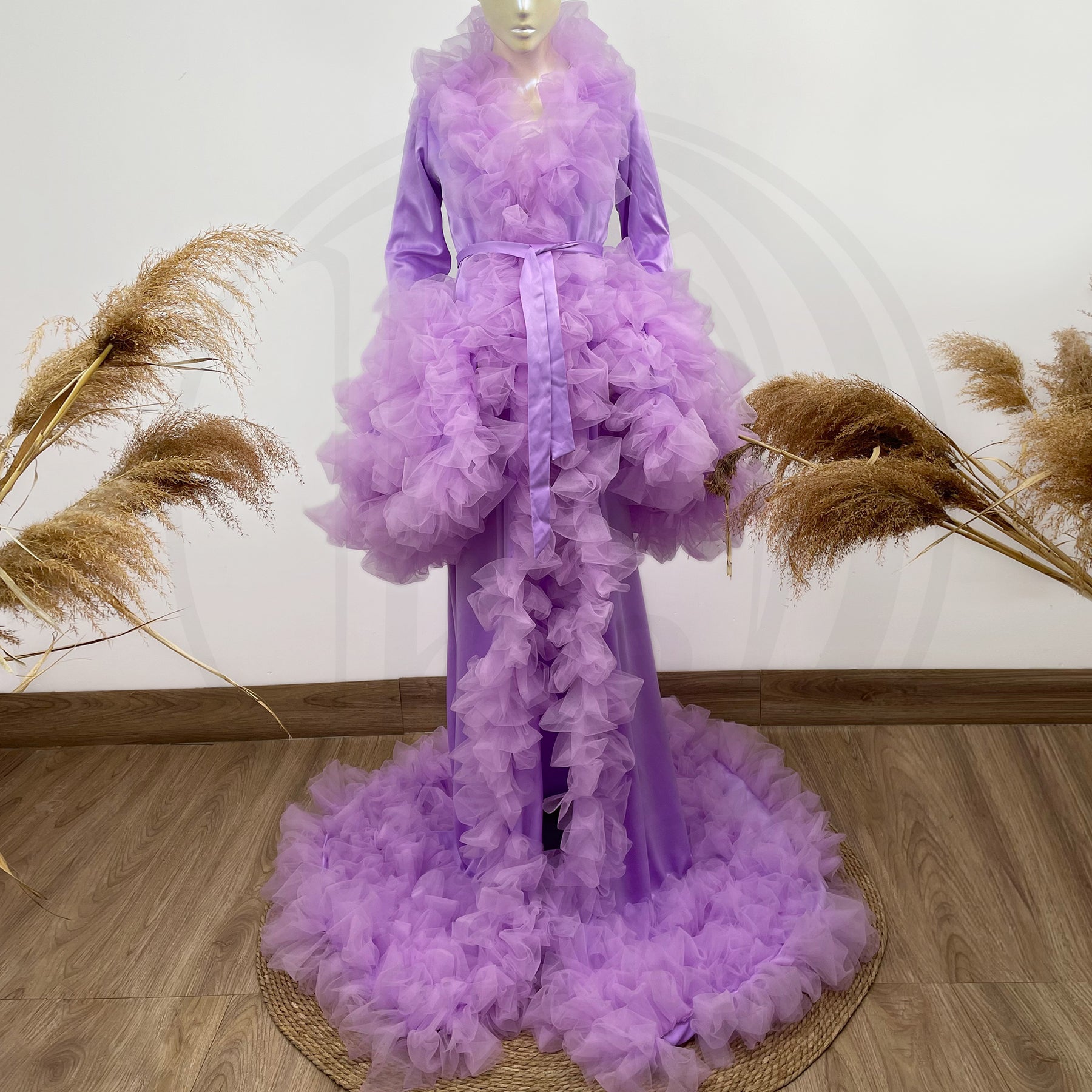 Soft satin silk fabric gown with tulle all around and bell sleeve looks really gorgeous! We accept customize.Please leave message for size you need when place order.