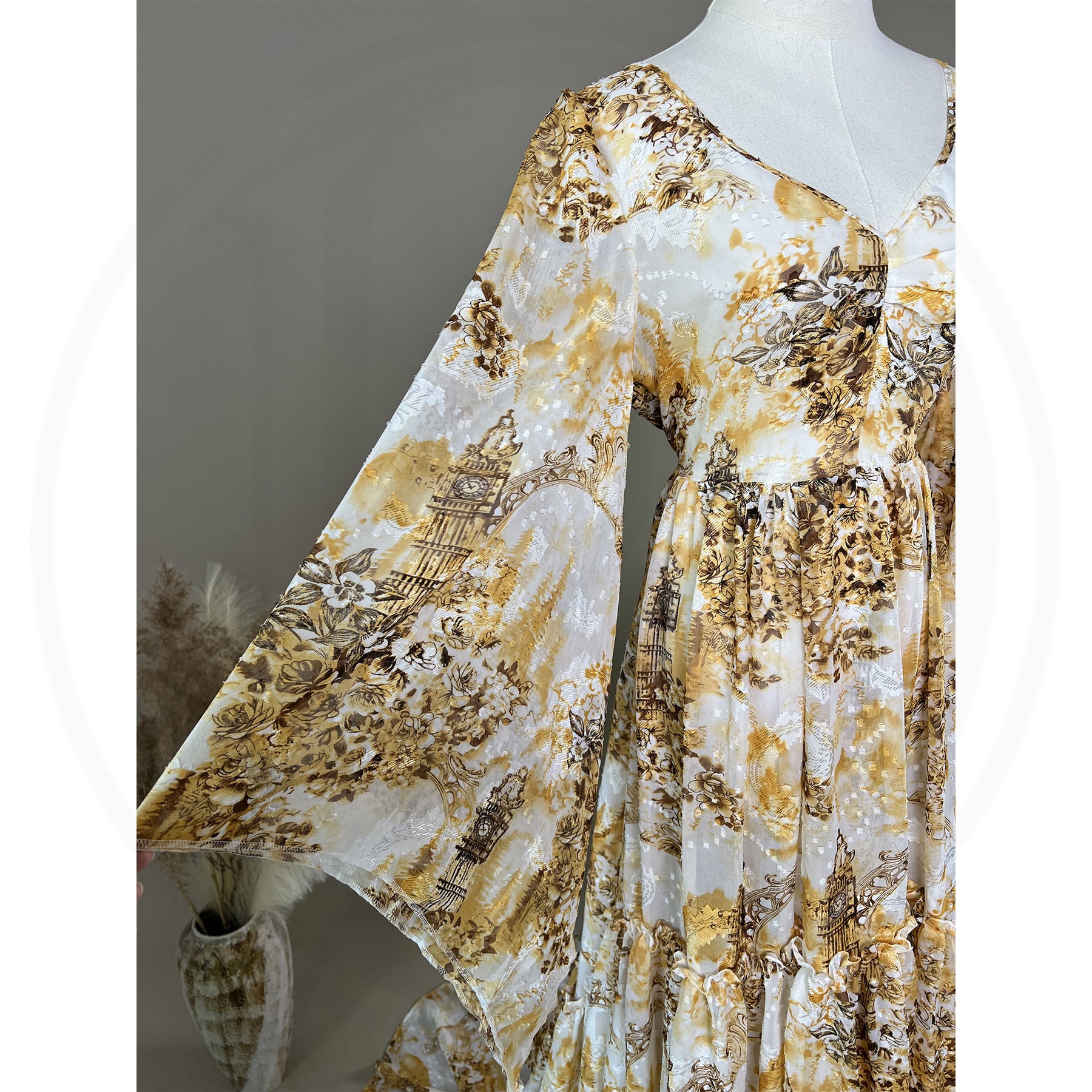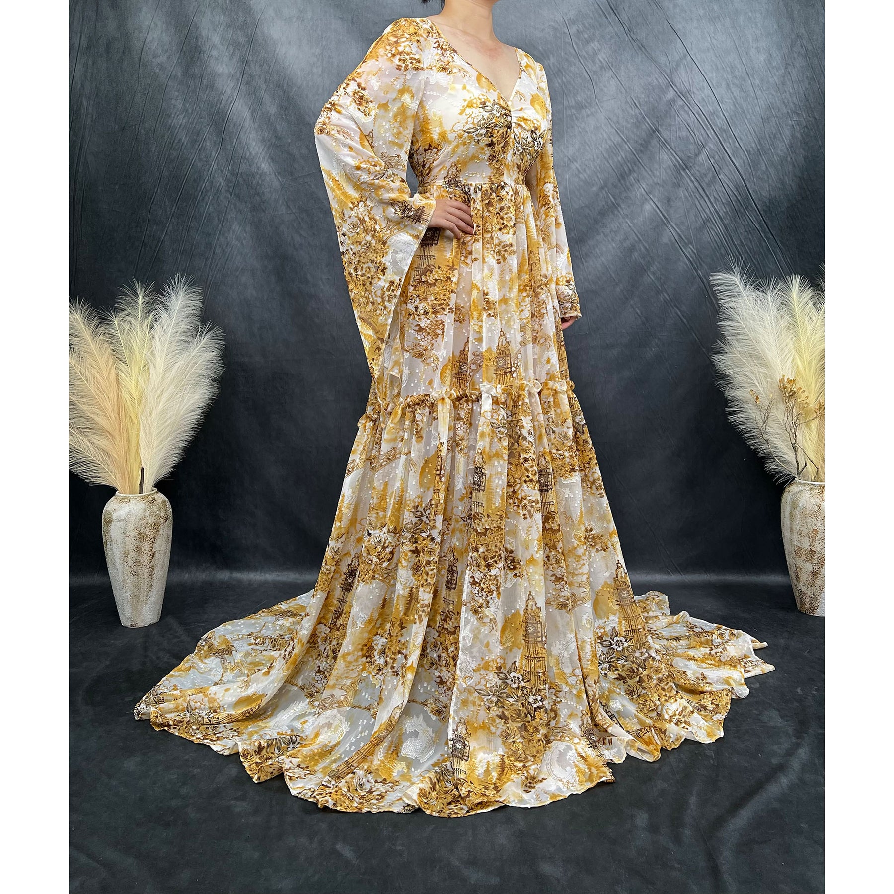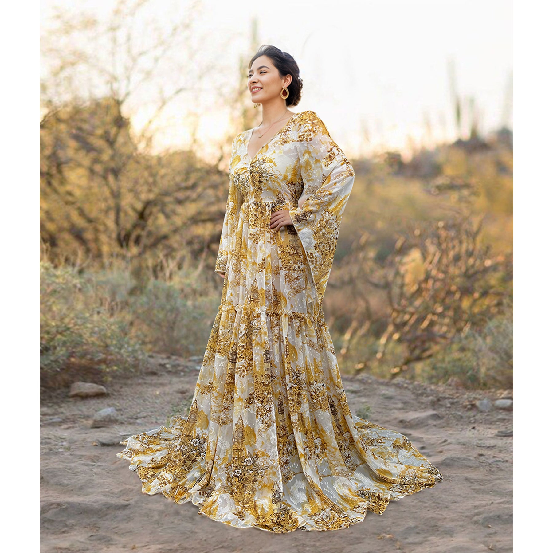 Product name: V-neck Long Sleeves Yellow Printed Chiffon Autumn Dress Maternity Gown for Photoshoot Party Gown Pregnancy Women Photography Dresses Baby Shower Gift