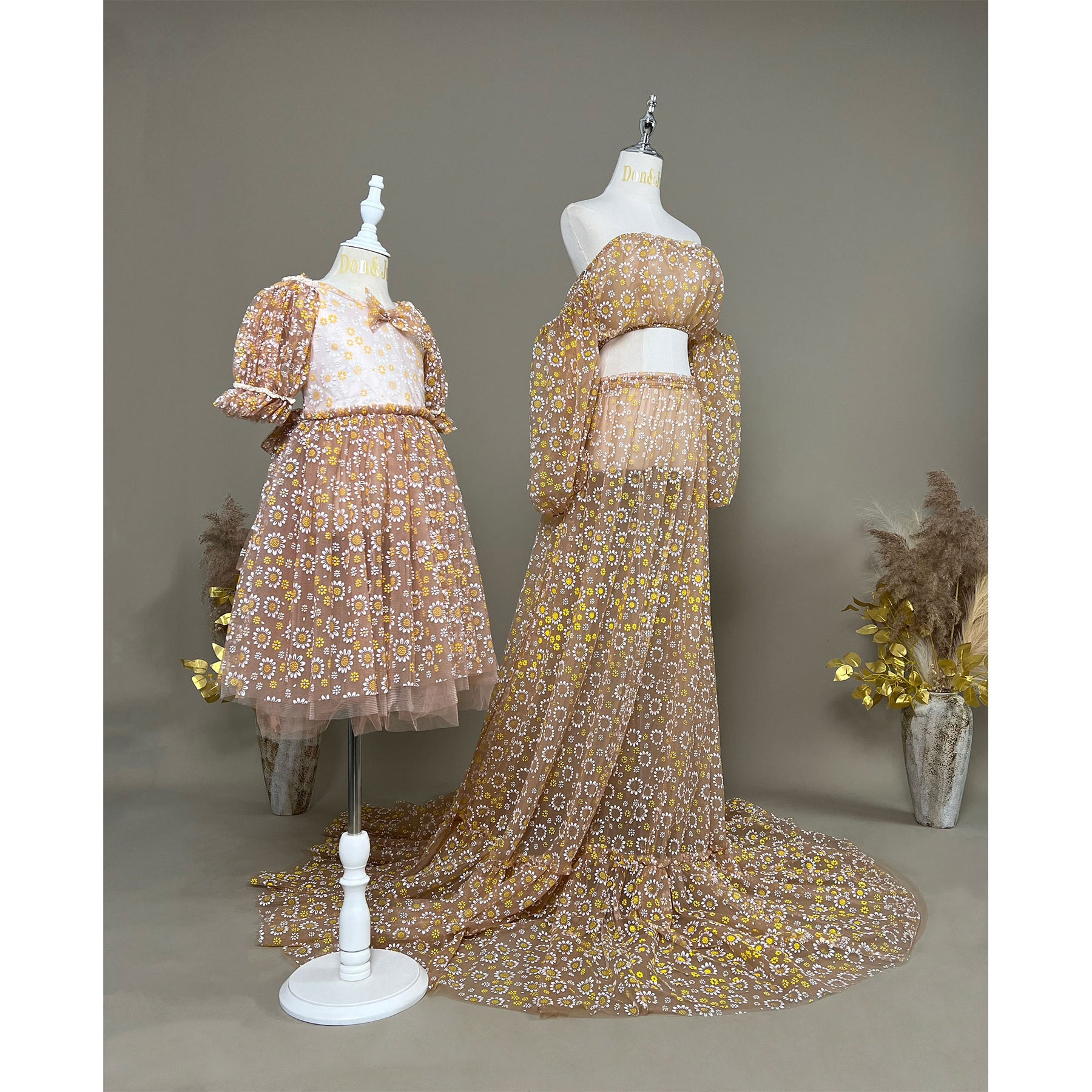 Product name: Daisy Flower Mommy Gown with Matched Little Gilrs 9-24 Month and 3-6years Old Dress Set Boho Dress Pregnancy Photography Dresses Bohemia Maxi Gown Photo Shoot Prop