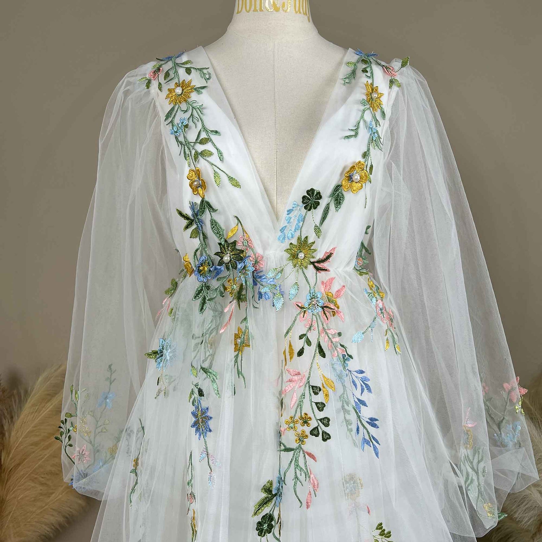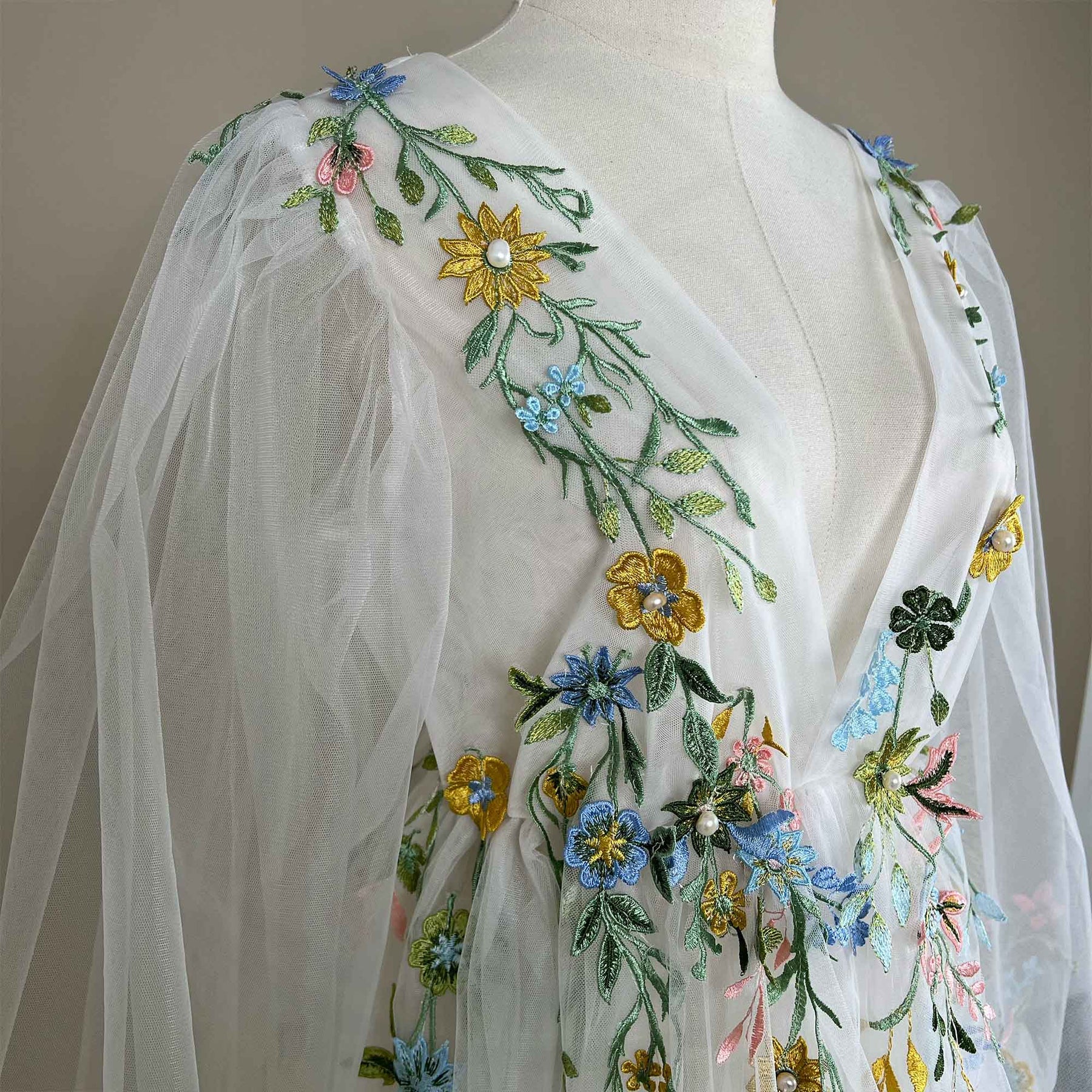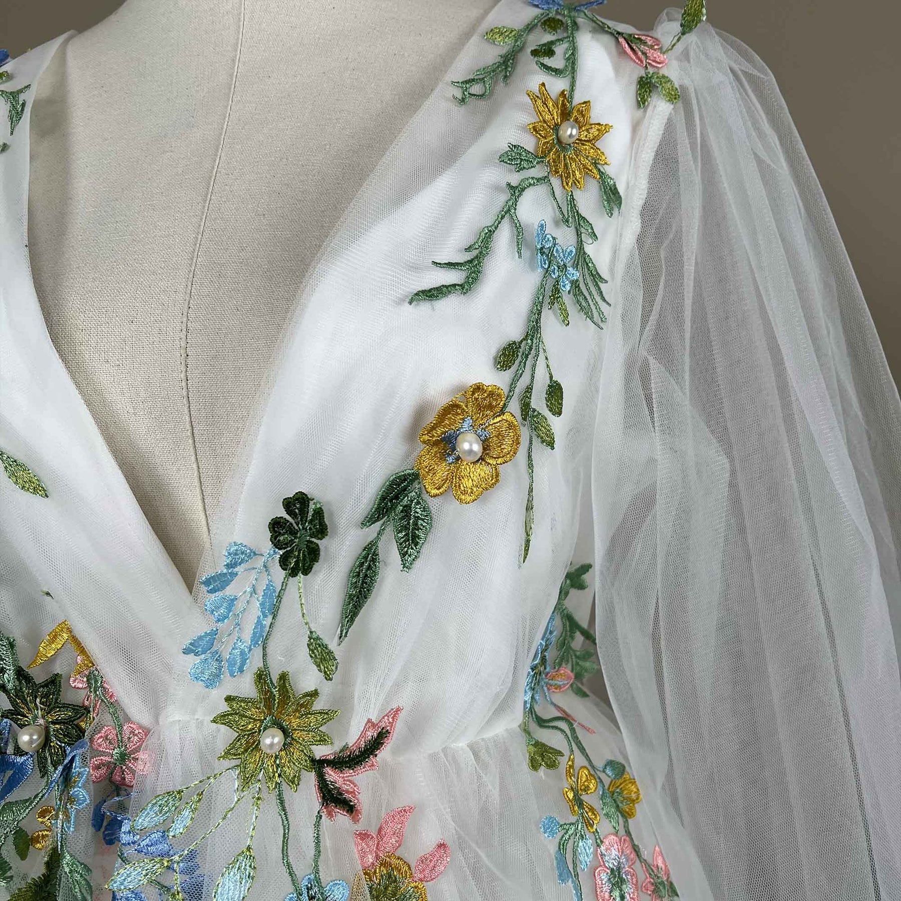 White Tulle V-Neck Puff Sleeve Dress with Green Embroidered Appliqué Gown for Photoshoot Baby Shower