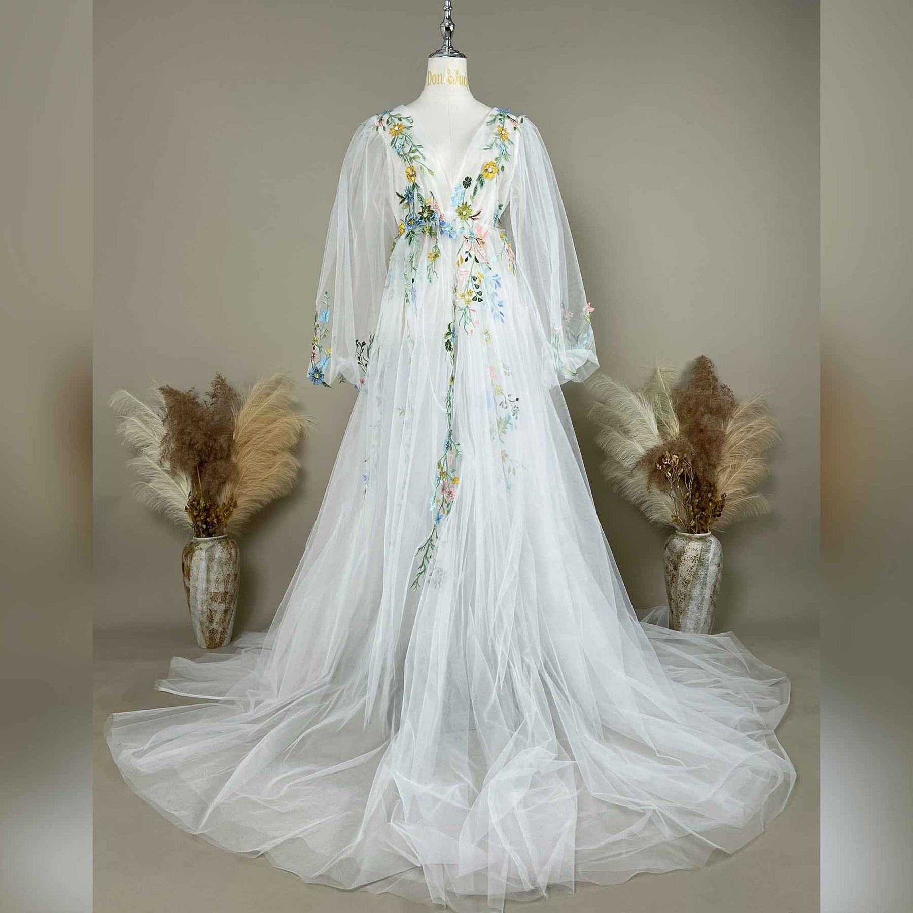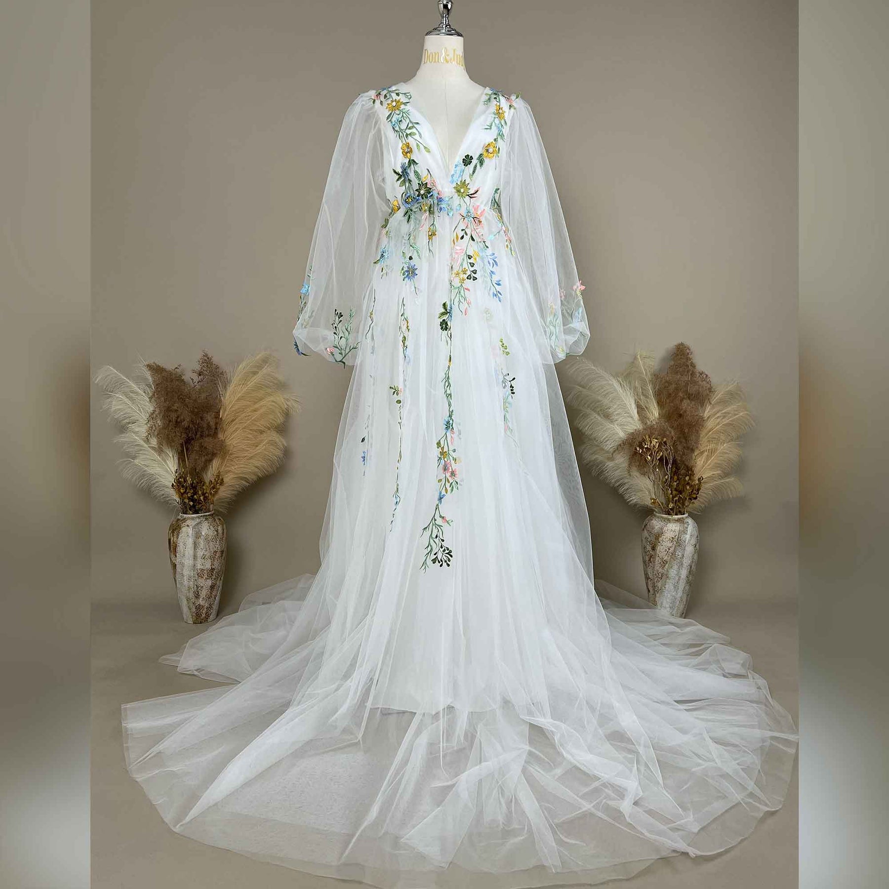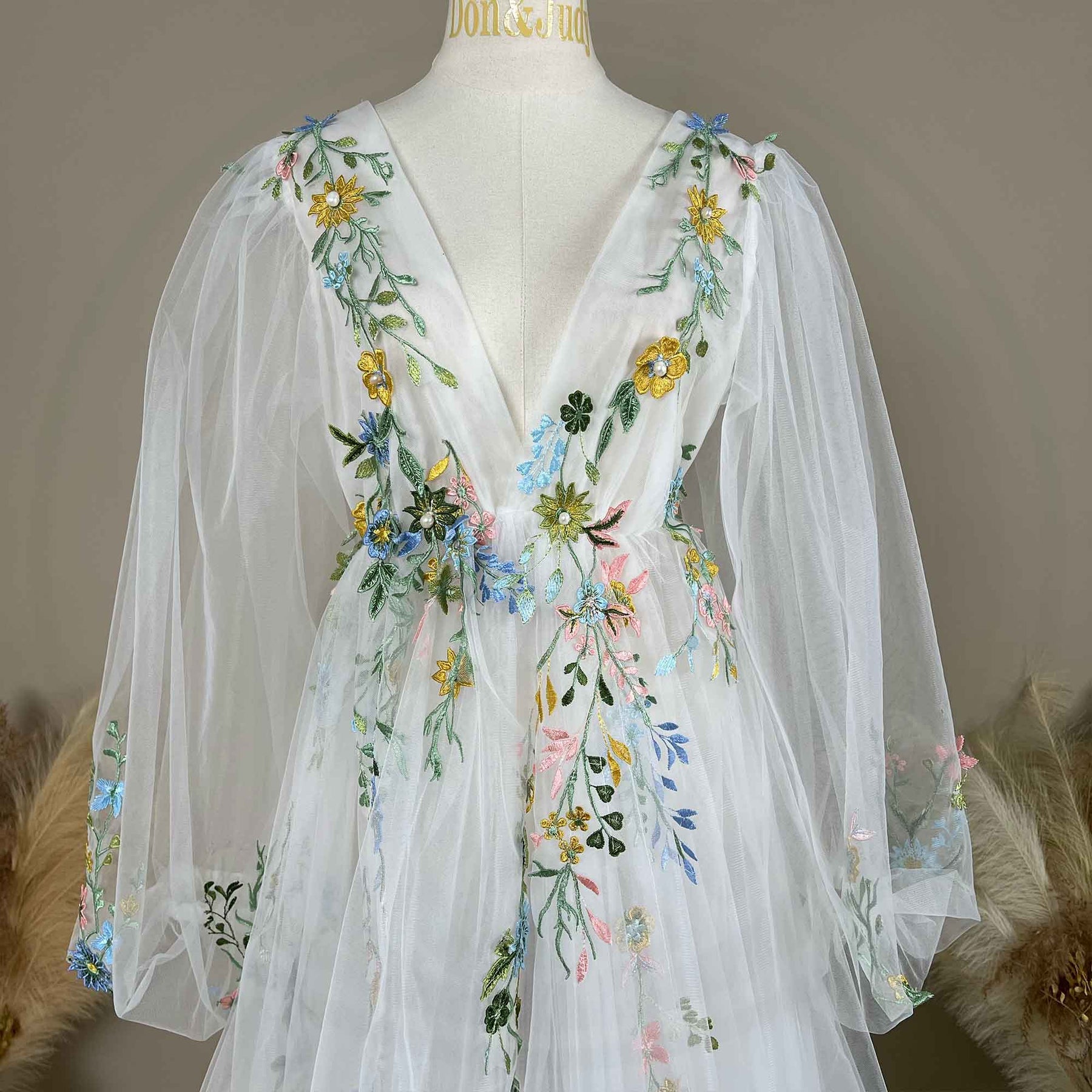 White Tulle V-Neck Puff Sleeve Dress with Green Embroidered Appliqué Gown for Photoshoot Baby Shower